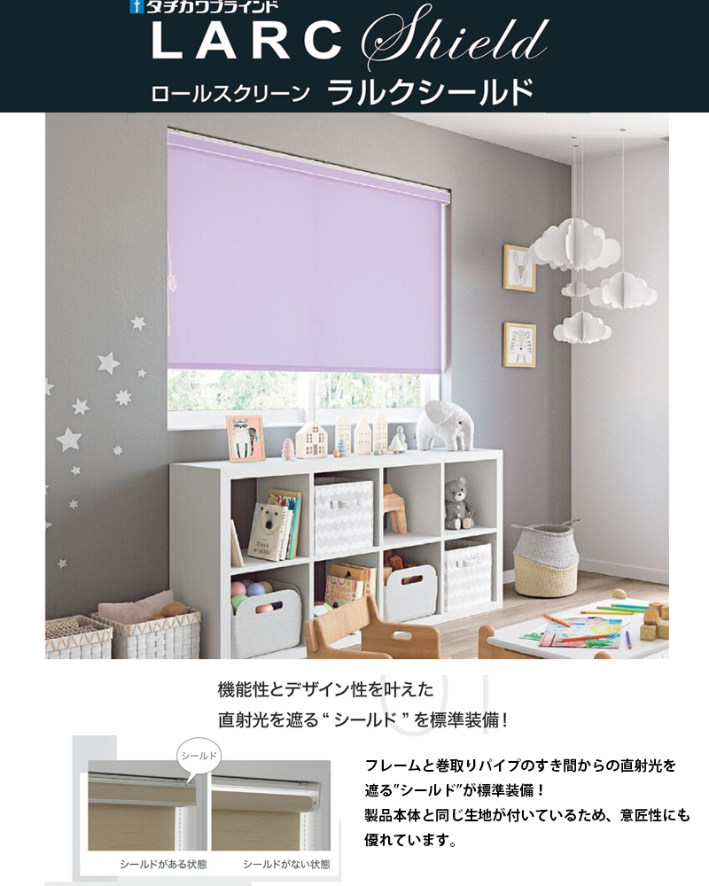 ラルクシールドは、ロールスクリーン上部のフレームと巻取りパイプのすき間から光が入るのを遮る”シールド”が標準でついています。 このため、せっかく光を遮るためにロールスクリーンを設置したのに眩しい・・・。などという事態を防げます。 逆に窓枠の外やカーテンボックスの中に取り付けるから、光漏れはないし、デザイン的にないほうがいい!という場合は”シールド”を無しにすることもできます。 今回お買い上げいただいたお客様には、”シールド”無しで販売させていただきました。 選んで頂いたスクリーンの生地はRS-1231ラベンダーです。淡くキレイな色味でお部屋が明るく色づきますね!ウォッシャブル生地なので汚れたらお洗濯することが可能です。 シールドの有無が選べる、オプション品にどんなものがあるか、など設置に際してよくわからないことがありましたらお気軽にお尋ねください。