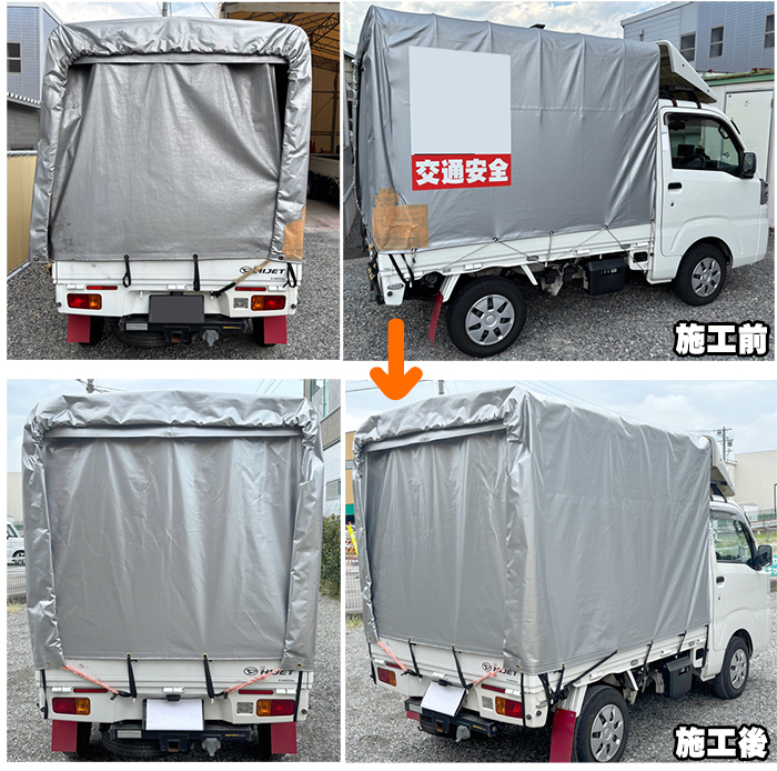 プロ用3方開き軽トラック幌を製作取り付けいたしました。内側断熱シート棚付自社工場でフレームもシートも製作しているから納期敏速、高品質でコストパフォーマンス抜群です。お客様より製作してくれる業者がなく当社がお受けし大変喜んでいただきました。※当社で購入頂いたプロ用プロ用3方開き軽トラック幌は修理にも対応しております。(有料) 修理のできる業者から購入することは、信頼の証です。トラック幌のことなら修理も購入も、マルヤマキャンバスにお気軽にご相談ください。高品質の製品を創り修理にも対応する、これがプロ用トラック幌シート。 マルヤマキャンバスはトータルでお客様のお役に立ちたいと念願しております。 その他、デザインテント、テント倉庫の新設、張り替え、透明糸入りカーテンも№1サービスのマルヤマキャンバスです。