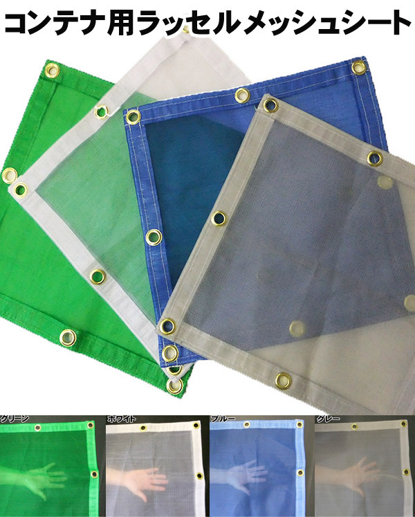 【ラッセルメッシュシート仕様】 ・カラー:グレー・グリーン・ブルー・ホワイト ・ハトメ:BK#28番(外径23mm、穴径12mm) ・周囲3mmソフトロープ+70mm内巻きPEテープ入り※
