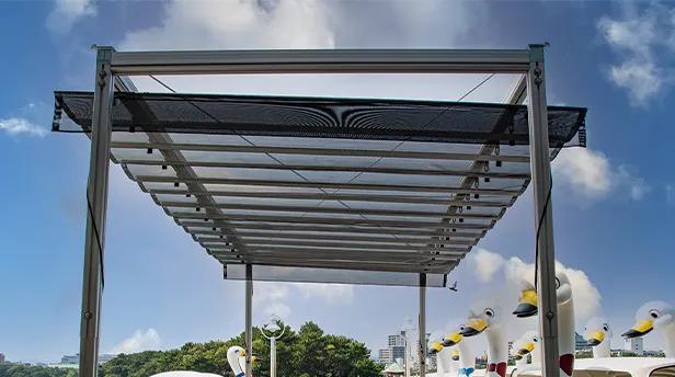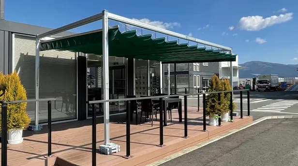 前高後低の片流れ形状屋根で、雨水は自然と後ろへ排水され天幕に溜まりません。